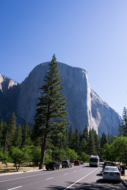 世界一の一枚岩。どーんと垂直に立ってます。その高さは1000m。。。道路から見上げるのですが、あまり近づきすぎると大きすぎて全景が見えません。ブライダルベール滝付近の道路から眺めるのが一番綺麗です。